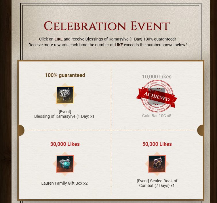 But wait, that’s not all happening in-game. Pearl Abyss will also be rewarding loyal players with some goodies for Likes on the official Remaster event page. Clicking the Like button will get you a Blessings of Kamasylve (1 Day) per family. This is a handy buff that provides boosts to plenty of things in-game for your character. If the Like button gets hit more times, more rewards will become unlocked. These includes Gold Bars, Lauren Family Gift Boxes and more.