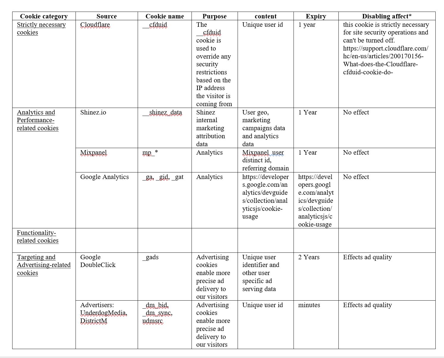 Below is a list of the cookies we use on our Site, which is dynamically updated whenever new cookies are encountered and classified by our Site team: