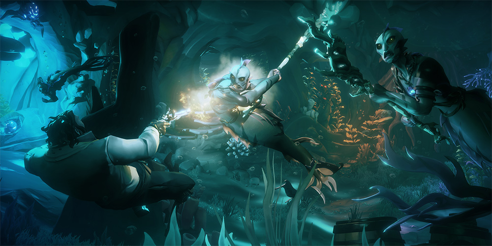 First experienced as part of the Tall Tales added in Season Three, the Sunken Kingdom now expands with numerous new areas accessible at any time in Season Four. Locations marked on the ship’s map and visible shimmering spots on the ocean’s surface indicate where pirates can dive down to investigate this mysterious undersea realm.