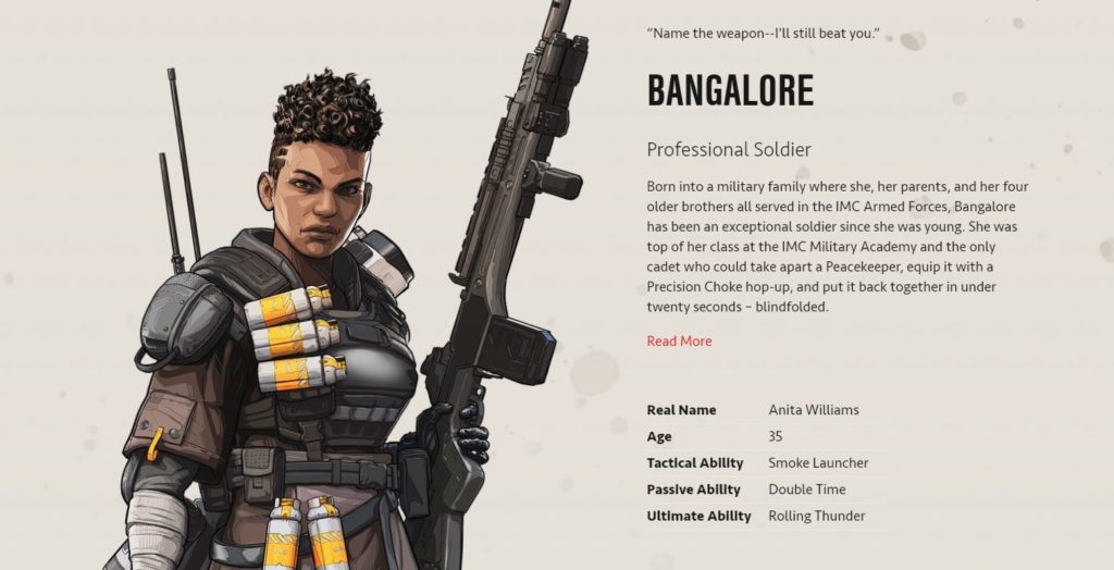 For players looking at Legends with high mobility, Bangalore is it. She’s very capable at dishing out damage and in true run-and-gun style, her abilities complement that play-style. Bangalore can unleash smoke grenades to cover impending offensive pushes, or to make a quick getaway. Just be careful, Bloodhound sees right through smoke. But being able to veil Lifeline or a team mate that’s reviving another is a huge boon for squads, and that’s good.