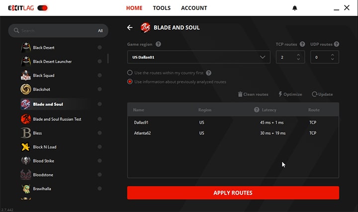 The real magic happens here, and ticking the “Use information about previously analyzes routes” will make ExitLag optimize your connection according to the optimized routes history. Simply put, it will find the best path to the game’s servers for you. You can also  see the estimated ping rating in the results. You can also manually pick your routes. Once happy, hit the Apply Routes button.